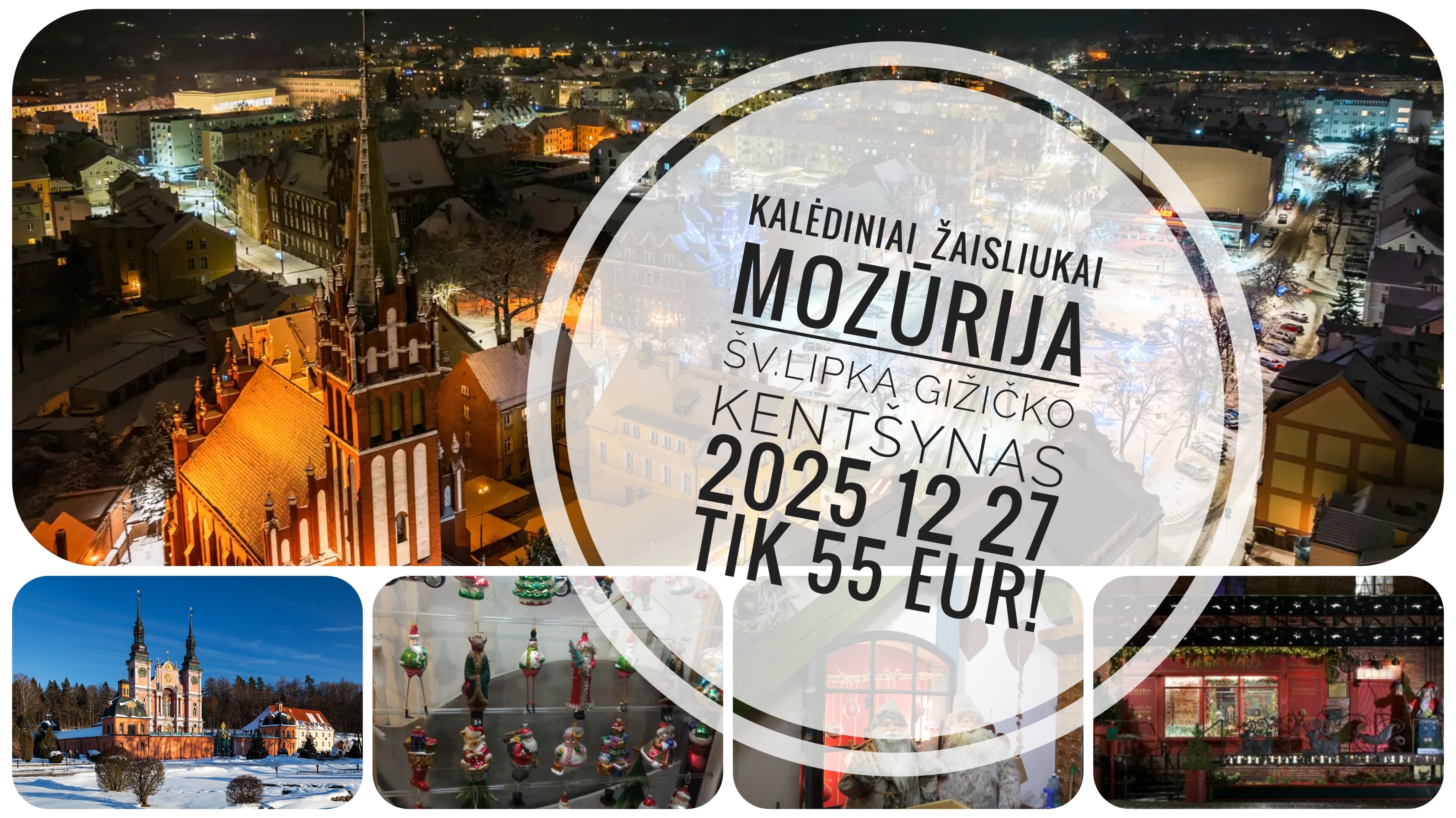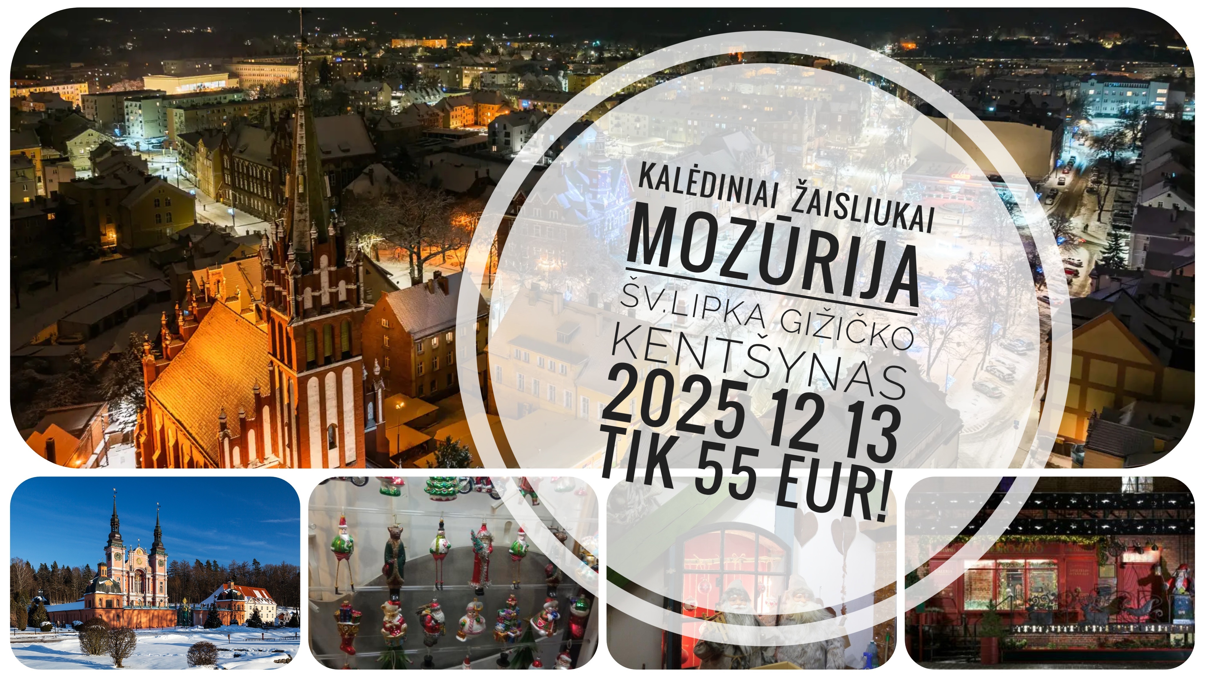 Keliausime pro Gižicko miestelį, vyksime į Šv. Lipką, kur lankysime įspūdingą barokinį vienuolyno ir bažnyčios ansamblį. Pasigrožėsime bažnyčioje „augančia“ liepa, matysime puikų altorių ir „šokančius" vargonus, kurie garsūs šventųjų figūrėlėmis, pamaldžiai linguojančiomis galvas vos tik užgrojus muzikai. Pasiklausę gražios vargonų muzikos, keliausime senaisiais Mozūrijos keliais į Kentšyno miestą, kuris garsus išlikusia kryžiuočių pilimi. Mieste lankysime Kalėdų senelio konsulatą, kuriame elfai darbuojasi stiklinių žaisliukų kalėdinėms eglutėms manufaktūroje. Čia ne tik pamatysime kaip gaminami stikliniai žaisliukai eglutėms, bet ir patys juos dekoruosime.